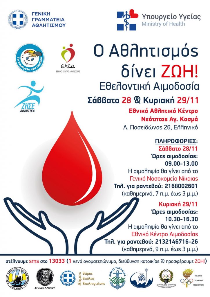 Tην Κυριακή 29 Νοεμβρίου (ώρες 10.30-16.30), θα πραγματοποιηθεί στις αθλητικές εγκαταστάσεις του Εθνικού Αθλητικού Κέντρου Νεότητας Αγίου Κοσμά εθελοντική αιμοδοσία, για την αντιμετώπιση των εποχιακών ελλείψεων αίματος λόγω της πανδημίας covid-19.