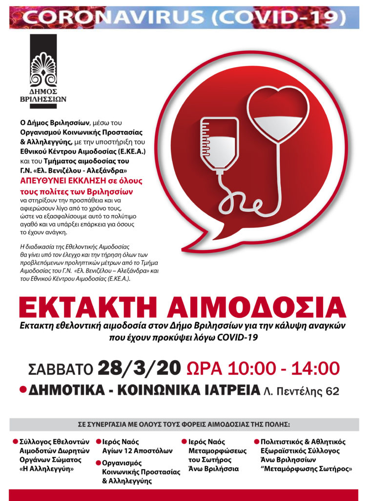 Έκτακτη εθελοντική αιμοδοσία στον δήμο Βριλησσίων το Σάββατο 28 Μαρτίου 2020