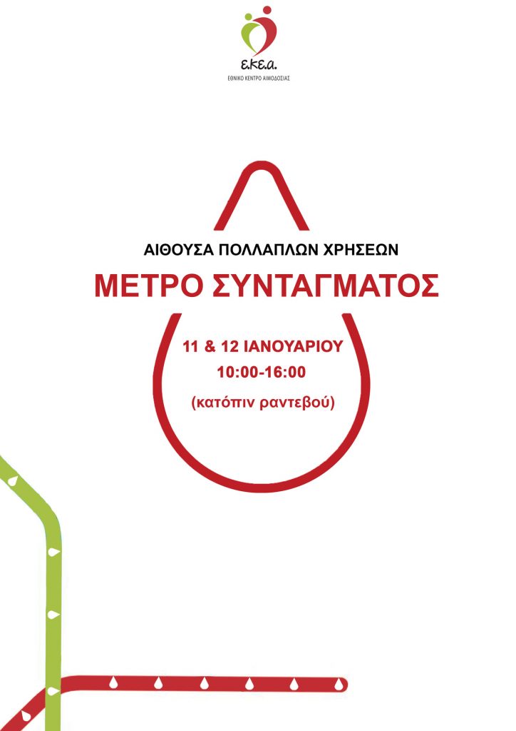 Το Ε.ΚΕ.Α. με πλήρη συναίσθηση της ευθύνης του για την ασφάλεια του αίματος και των αιμοδοτών, αλλά και για την επάρκεια των αποθεμάτων αίματος της χώρας οργανώνει σε συνεργασία με τη ΣΤΑΣΥ Α.Ε., διήμερη εθελοντική αιμοδοσία στην Αίθουσα Πολλαπλών Χρήσεων του Μετρό Συντάγματος, τη Δευτέρα 11 και την Τρίτη 12 Ιανουαρίου από τις 10:00 το πρωί έως τις 16:00 το απόγευμα.