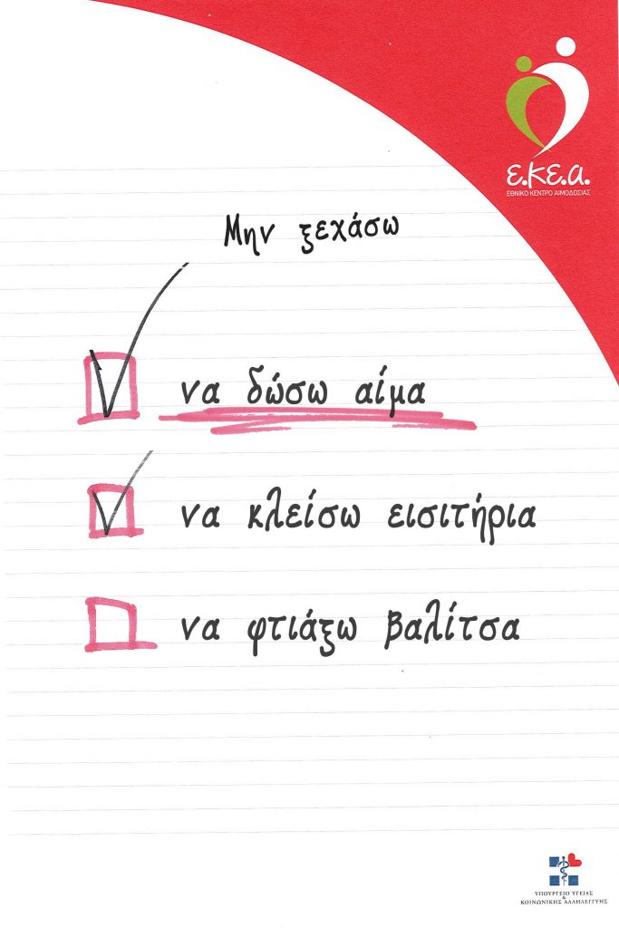 Όμως φέτος χρειάζεται να κάνουμε τη διαφορά. Το Ε.ΚΕ.Α με πλήρη συναίσθηση της ευθύνης του για την ασφάλεια του αίματος και των αιμοδοτών αλλά και για την επάρκεια των αποθεμάτων αίματος της χώρας μας, κάνει έκκληση στους αιμοδότες, παλιούς και νέους, να ανταποκριθούν στις ανάγκες αυτής της δύσκολης περιόδου και να προσέλθουν με διάθεση προσφοράς στις Αιμοδοσίες, που οι διάφοροι σύλλογοι και φορείς συνεχίζουν να οργανώνουν, καθώς και στις Υπηρεσίες Αιμοδοσίας των νοσοκομείων.