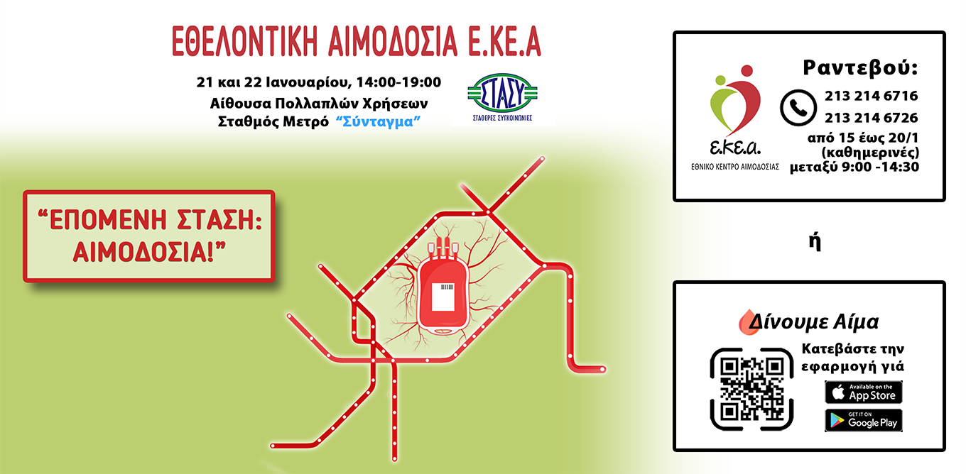 Λαμβάνοντας υπόψη ότι συνήθως μετά τη χαλαρή περίοδο των γιορτών και της ξεκούρασης, παρατηρείται μείωση της προσέλευσης των εθελοντών αιμοδοτών, με άμεσες συνέπειες στους πολυμεταγγιζόμενους ασθενείς και τους πάσχοντες με μεσογειακή αναιμία, το Ε.ΚΕ.Α. οργανώνει σε συνεργασία με τη ΣΤΑΣΥ Α.Ε., διήμερη εθελοντική αιμοδοσία στην Αίθουσα Πολλαπλών Χρήσεων του Μετρό Συντάγματος, την Τρίτη 21 και Τετάρτη 22 Ιανουαρίου 14.00-19.00, ένα ωράριο που εστιάζει στη διευκόλυνση των αιμοδοτών που δεν μπορούν να προσέλθουν σε ένα σημείο αιμοδοσίας τις πρωινές ώρες εξαιτίας της εργασίας τους.