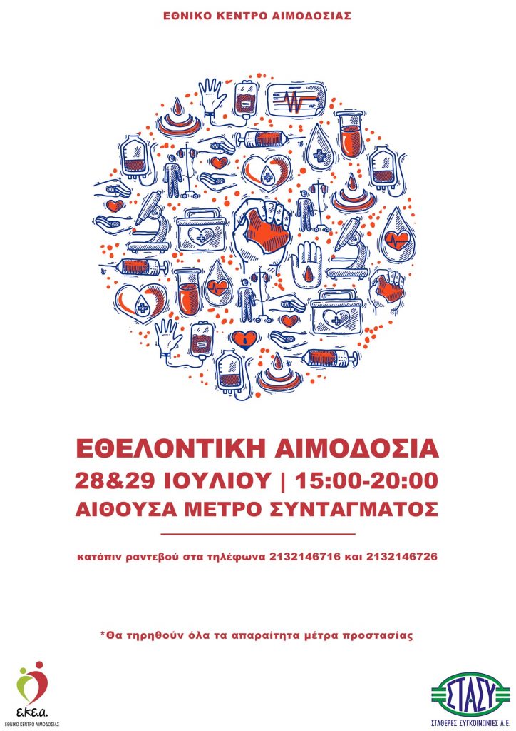 Για τους λόγους αυτούς, το ΕΚΕΑ, καλεί νέους και παλιούς εθελοντές αιμοδότες να ανταποκριθούν στις ανάγκες αυτής της δύσκολης περιόδου και να προσέλθουν στην Εθελοντική Αιμοδοσία την Τετάρτη 28 και την Πέμπτη 29 Ιουλίου στην αίθουσα πολλαπλών χρήσεων του ΜΕΤΡΟ Συντάγματος, από τις 3 το μεσημέρι μέχρι τις 8 το απόγευμα