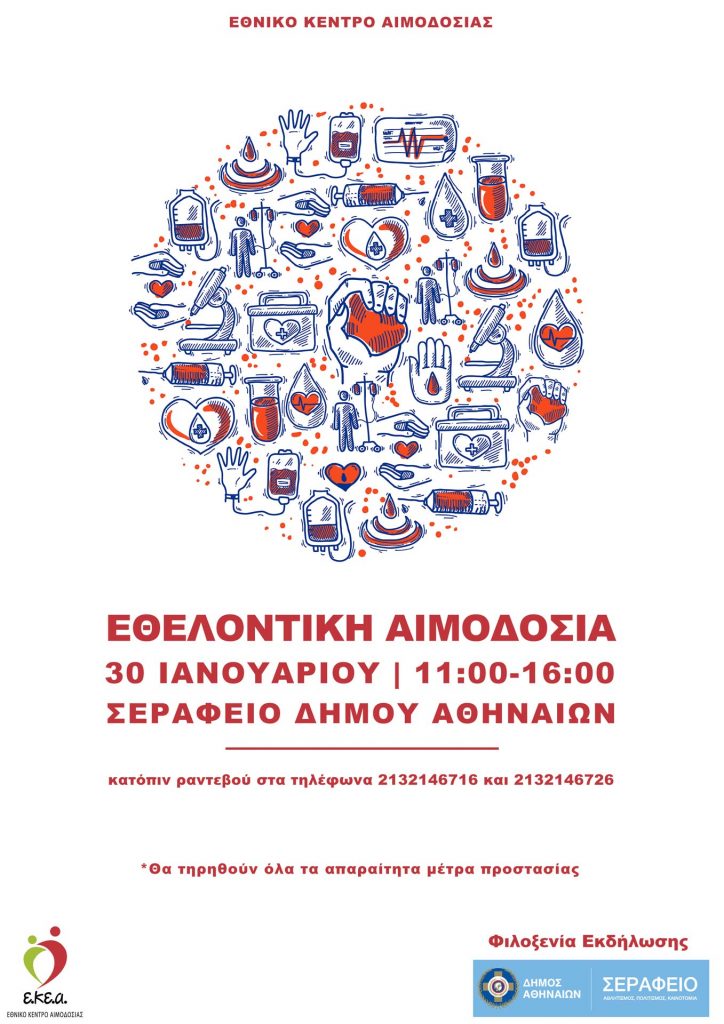 «ΔΡΑΣΗ ΕΘΕΛΟΝΤΙΚΗΣ ΑΙΜΟΔΟΣΙΑΣ 30 ΙΑΝΟΥΑΡΙΟΥ ΣΤΟ ΣΕΡΑΦΕΙΟ ΤΟΥ ΔΗΜΟΥ ΑΘΗΝΑΙΩΝ»