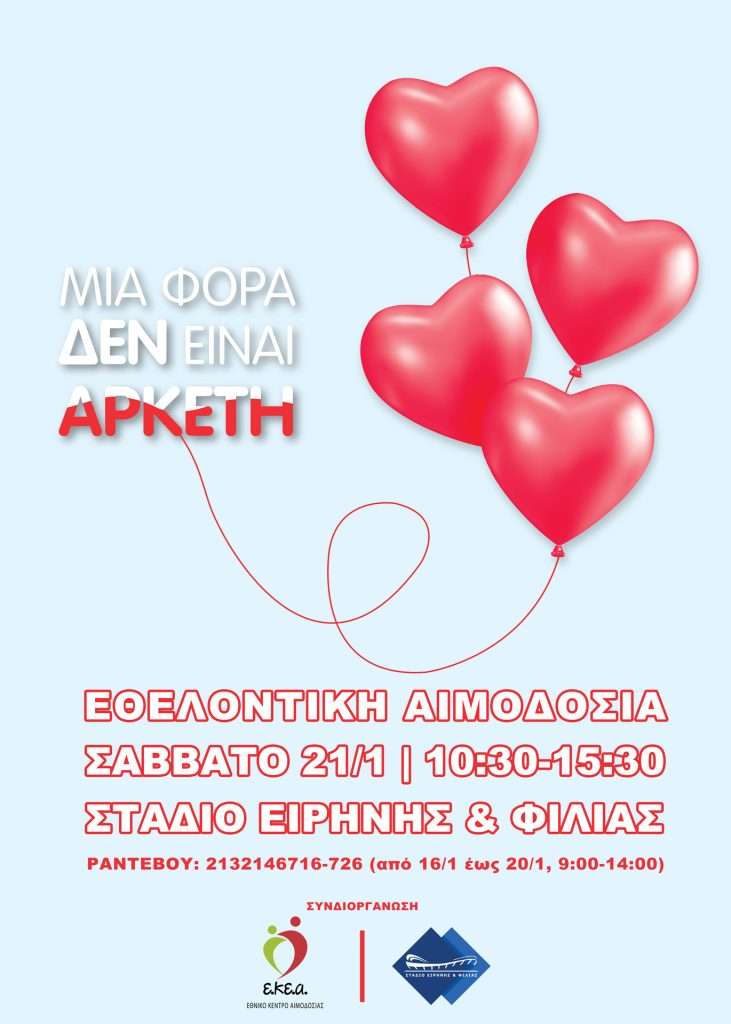 - To Σάββατο 21.01, από τις 10.30πμ έως τις 15.30μμ, το Εθνικό Κέντρο Αιμοδοσίας και το Στάδιο Ειρήνης και Φιλίας (Σ.Ε.Φ.) συνδιοργανώνουν αιμοδοσία στο φουαγιέ επισήμων του Σ.Ε.Φ. (Είσοδος θύρα επισήμων, Λ. Εθνάρχου Μακαρίου 1, Νέο Φάληρο). Για τον προσδιορισμό ραντεβού, μπορείτε να επικοινωνείτε σήμερα Παρασκευή 20.01, μέχρι τις 14.30 στα τηλέφωνα 2132146716-726.