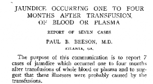 Σε δημοσίευση του στο ιατρικό περιοδικό JAMA, ο Dr. Paul Beeson συσχετίζει την εμφάνιση ίκτερου σε επτά περιστατικά με τη μετάγγιση αίματος ή πλάσματος που έλαβαν οι συγκεκριμένοι ασθενείς λίγους μήνες νωρίτερα, περιγράφοντας κατ΄αυτό τον τρόπο ουσιαστικά την πρώτη αναφορά για μετά μετάγγιση –ηπατίτιδα.