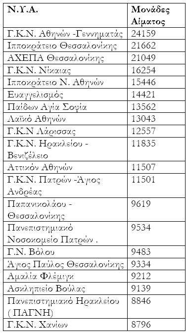 Έτσι τα είκοσι καλύτερα νοσοκομεία . με κριτήριο τον αριθμό των μονάδων αίματος που συλλέγουν , είναι τα κάτωθι: