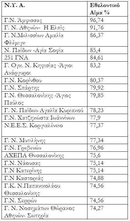 Με κριτήριο το ποσοστό του Εθελοντικού αίματος που συλλέγουν , τα είκοσι νοσοκομεία με τις καλύτερες επιδόσεις είναι :