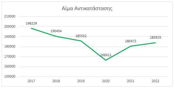 Αξιοσημείωτο είναι ότι το 2022 συλλέχθηκαν περισσότερες μονάδες εθελοντικού αίματος και από αυτό το 2018 όπου είχαμε την τραγωδία στο Μάτι Αττικής , όταν και εμφανίστηκε μια έξαρση του εθελοντισμού. Παράλληλα η εξάρτηση από το αίμα αντικατάστασης δηλ. το αίμα που προέρχεται από το οικογενειακό και φιλικό περιβάλλον των ασθενών φαίνεται ότι μειώνεται σημαντικά .