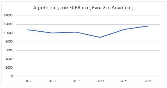 Η συμβολή των Ενόπλων Δυνάμεων στην εξασφάλιση επάρκειας αίματος στην χώρα μας είναι σημαντική και αναντικατάστατη. Έτσι από τις ανάλογες εξορμήσεις του ΕΚΕΑ φαίνεται η συμβολή των Ε. Δ. στο χρόνο , που σημειωτέον είναι μέρος του συνόλου.