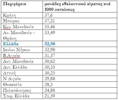 Ειδικότερα η εικόνα της συλλογής εθελοντικού αίματος ανά περιφέρεια και στην επικράτεια αποδίδεται στον κάτωθι πίνακα.