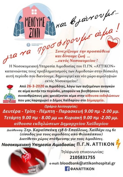 Νέος χώρος Αιμοληψιών του Π.Γ.Ν. «ΑΤΤΙΚΟΝ» στην αίθουσα εκδηλώσεων Δήμου Χαϊδαρίου 30/03/2020 / Νέα-Ειδήσεις Νέος χώρος Αιμοληψιών του Π.Γ.Ν. «ΑΤΤΙΚΟΝ» στην αίθουσα εκδηλώσεων Δήμου Χαϊδαρίου