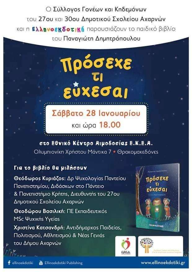Το Σάββατο 28 Ιανουαρίου, στις 18.00μμ  το Εθνικό Κέντρο Αιμοδοσίας θα φιλοξενήσει την παρουσίαση του παιδικού βιβλίου του Παναγιώτη Δημητρόπουλου “Πρόσεχε τι εύχεσαι”. Η εκδήλωση, που διοργανώνουν, ο Σύλλογος Γονέων και Κηδεμόνων των 27ου & 30ου Σχολείων Ολυμπιακού Χωριού και η Ελληνοεκδοτική, θα πραγματοποιηθεί στην αίθουσα εκδηλώσεων του Ε.ΚΕ.Α. και θα έχει διαδραστικό χαρακτήρα, τόσο αναφορικά με τον τρόπο παρουσίασης-αφήγησης του παραμυθιού όσο και των βιωματικών παιχνιδιών που θα ακολουθήσουν και θα βοηθήσουν τα παιδιά να εμβαθύνουν στις βασικές έννοιες του παραμυθιού (αυτογνωσία, ενσυναίσθηση, εμπιστοσύνη, δικαιοσύνη, ολιγάρκεια  αλλά και η αθώα παιδική απληστία και εγωκεντρισμός).