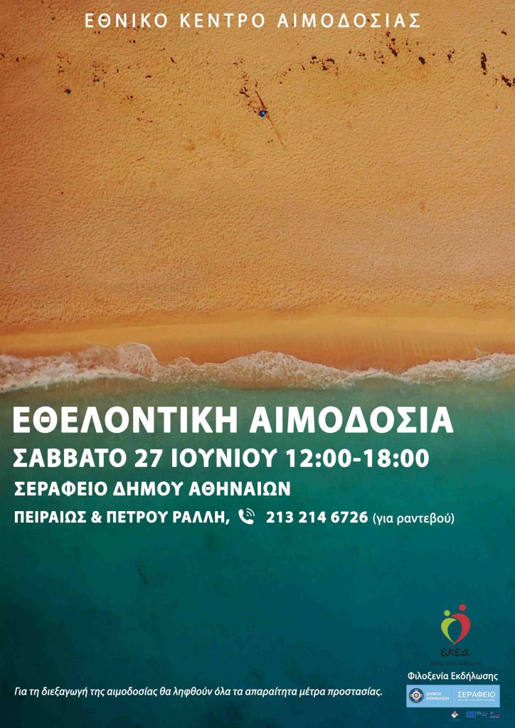 Το Εθνικό Κέντρο Αιμοδοσίας, μέσα στο πλαίσιο της προσπάθειάς να βρίσκεται με συνέχεια και συνέπεια κοντά στον εθελοντή αιμοδότη, διοργανώνει καλοκαιρινή εθελοντική αιμοδοσία, το Σάββατο 27 Ιουνίου (12.00-18.00) στο Σεράφειο  Δήμου Αθηναίων, ένα χώρο κεντρικό, ασφαλή, μοντέρνο και προσιτό σε όλες τις ηλικίες.