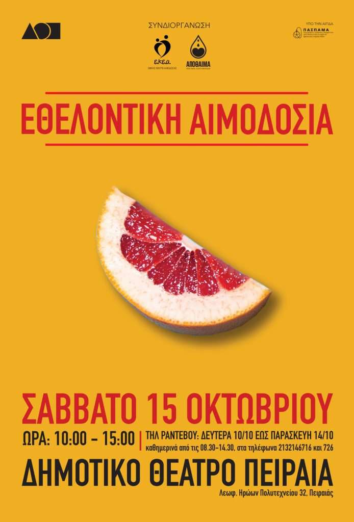 Στο πλαίσιο αυτό και για την αντιμετώπιση των αυξημένων αναγκών σε αίμα, που έχουν παρουσιαστεί την τελευταία περίοδο, το Εθνικό Κέντρο Αιμοδοσίας και η εθελοντική ομάδα ΑΠΟΘΑΙΜΑ, ενώνουν τις δυνάμεις τους, πραγματοποιώντας δράση αιμοδοσίας για πρώτη φορά στο ιστορικό Δημοτικό Θέατρο Πειραιά (Λεωφόρος Ηρώων Πολυτεχνείου 32 Πειραιάς, www.dithepi.gr ), έναν χώρο που αποτελεί σημείο αναφοράς για τους κατοίκους του Πειραιά και των νοτίων προαστίων, το Σάββατο 15/10/2022 από τις 10.00πμ-15.00μμ. Η πρόσβαση στον χώρο διευκολύνεται ακόμα περισσότερο με την παράδοση και χρήση από το επιβατικό κοινό, του νέου σταθμού Μετρό «Δημοτικό Θέατρο Πειραιά».